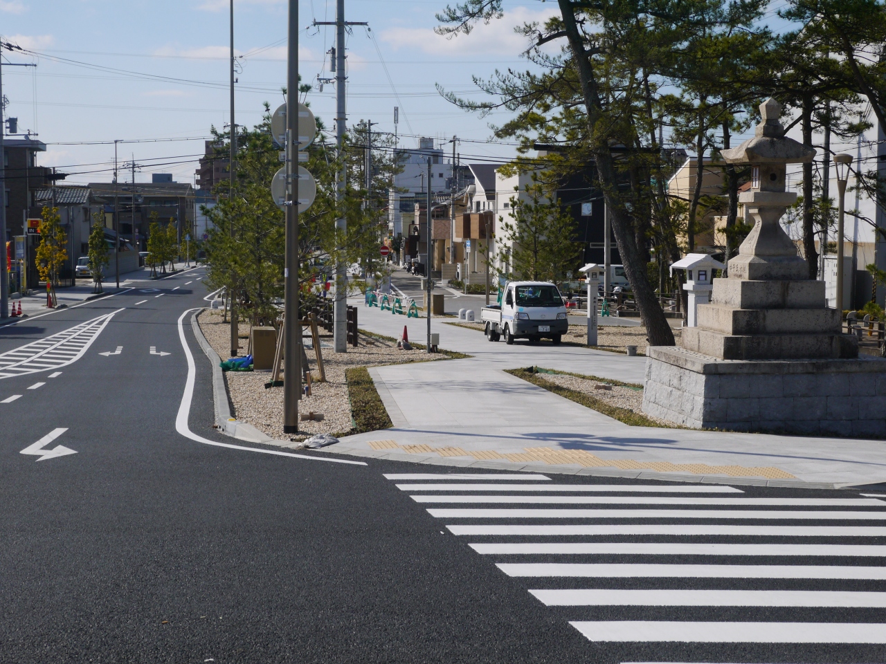 工事中であった南北の石畳参道(歩行者用、自転車は?)とその横の車道がほぼ完成し、散歩や歩きでのアプローチが良くなりました。参道沿いの松並木が往時を彷彿とさせます。