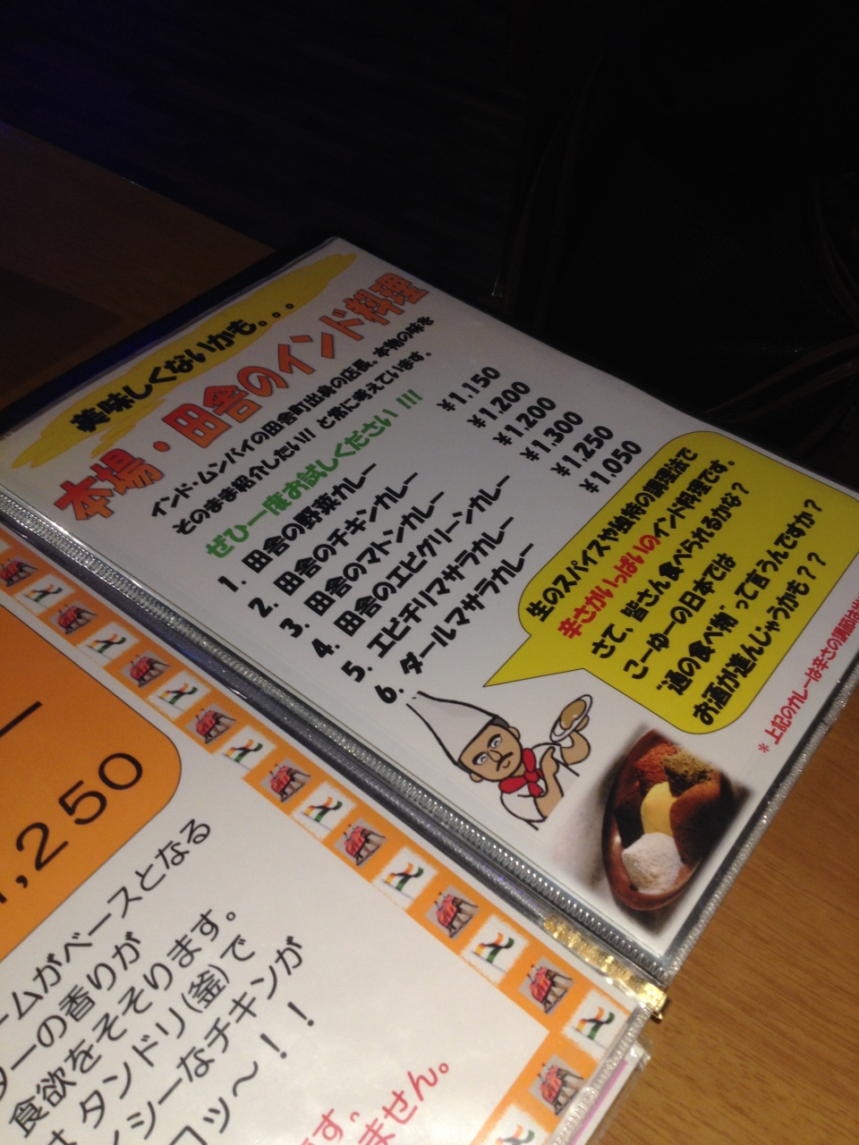 ちょっと遅い時間でしたが、インド料理を食べようとこちらを訪問。駅近にもかかわらず広い店内。壁にはオススメのメニューの張り紙が貼られています。