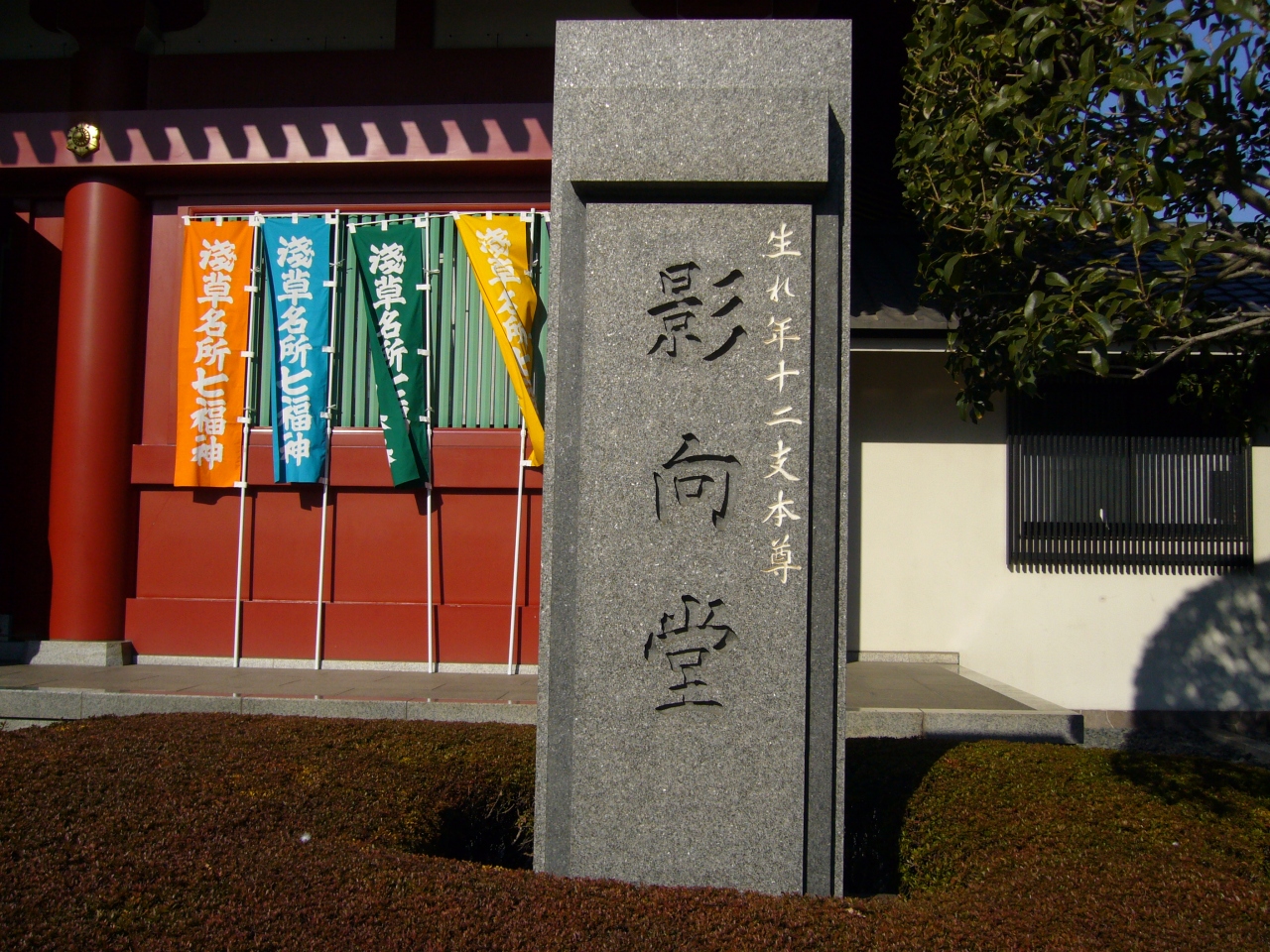 本堂の西側には影向堂(ようごうどう)があります。1994年、開山慈覚大師ご生誕1200年を記念して建立されました。朱色の美しい建物で、生まれ年十二支本尊が安置されています。みなさんご自身をお守りしてくださる本尊をみつけて参拝してくださいね。