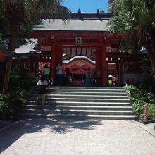 青島バス停から、参道の商店街を通り、橋を渡った少し先に神社の入口の鳥居があり、