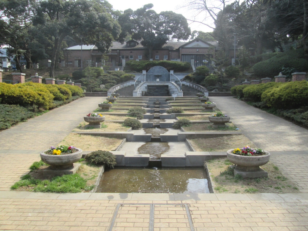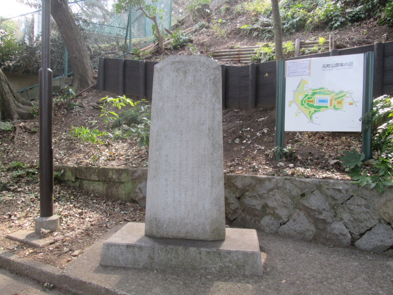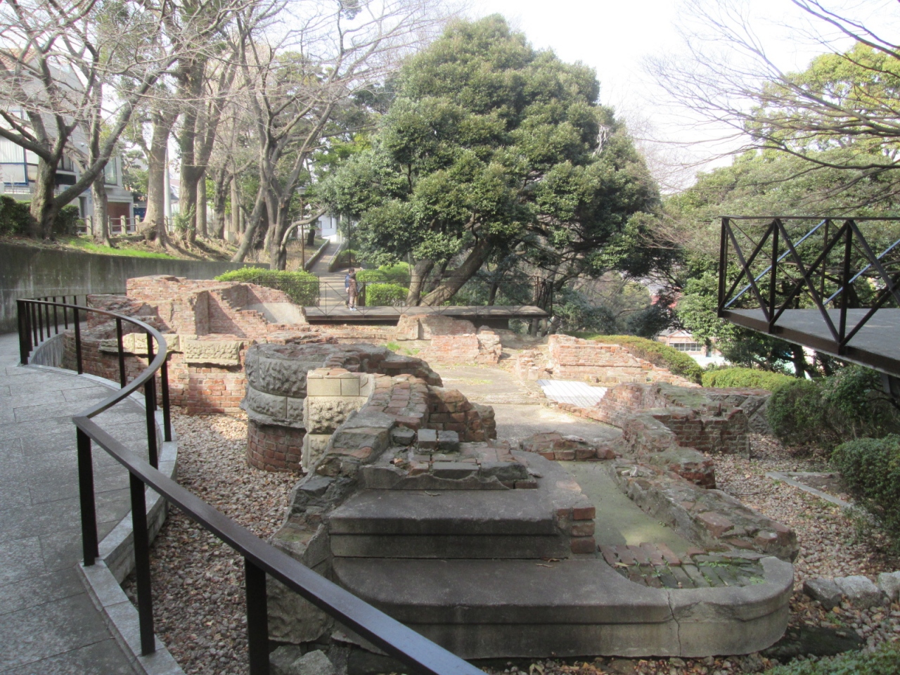 洋館の建ち並ぶ山手本通り、その「エリスマン邸」と「ベーリックホール」から公園が始まります。両館の間を入ると、関東大震災で倒壊した「山手80番館跡」があります。現在は地階部分だけが残っており、見学通路が設けてあります。「山手80番館」を越えると、木立の下にはベンチがいくつも置かれ、休息ポイントになっています。さらに丘を下って行くと、「ジェラールの瓦工場と水屋敷跡」と書かれた碑があります。フランスの実業家ジェラールが、この場所で在日西洋人のための西洋瓦を焼き、また船舶に給水するために建設した貯水槽を記念したものです。横には「我国塗装発祥之地記念碑」というものも立てられていて、そこでは中華学校の子ども達が中国語をしゃべりながら(当たり前ですね)遊んでいました…横浜らしい光景ですね。