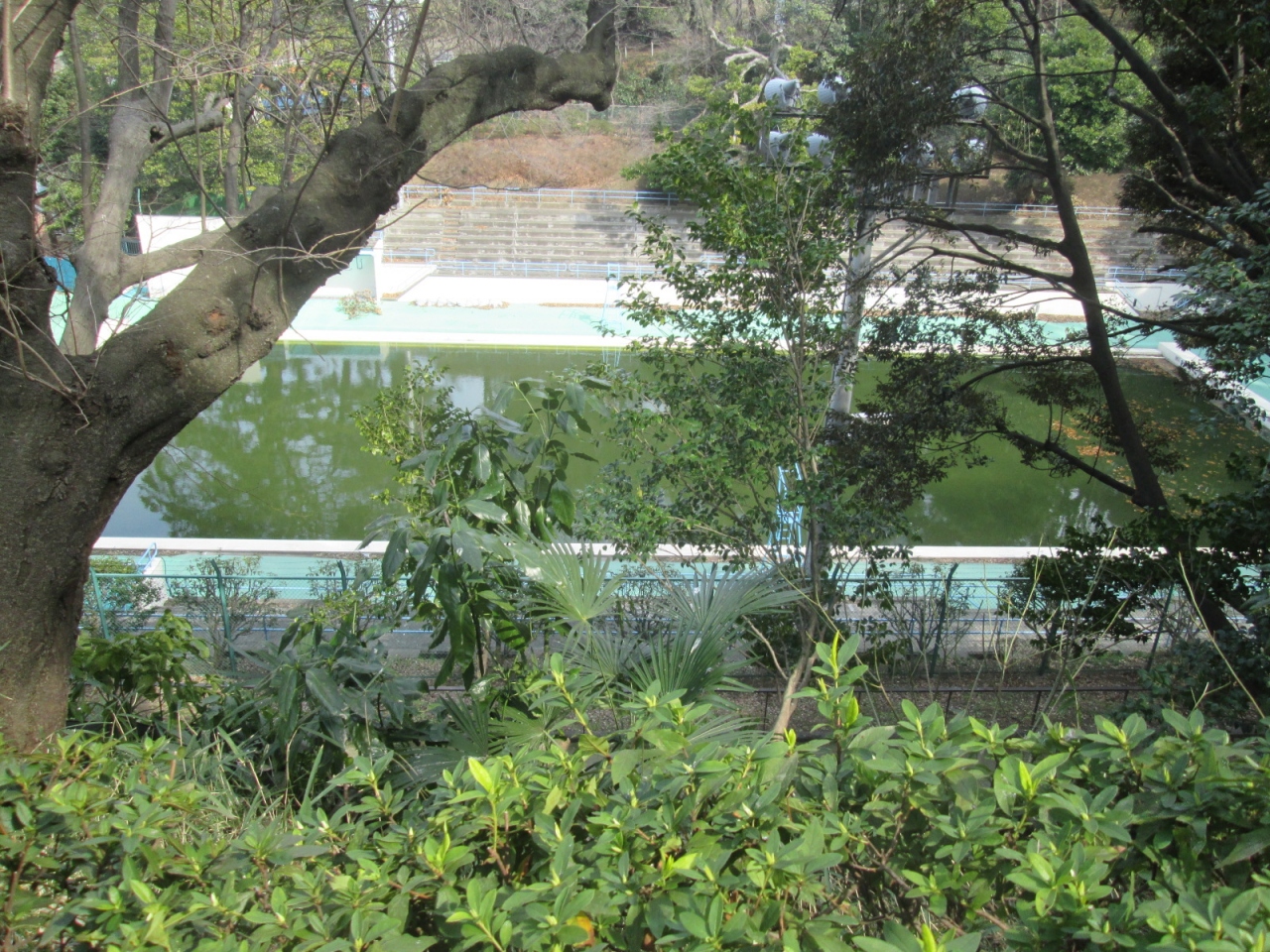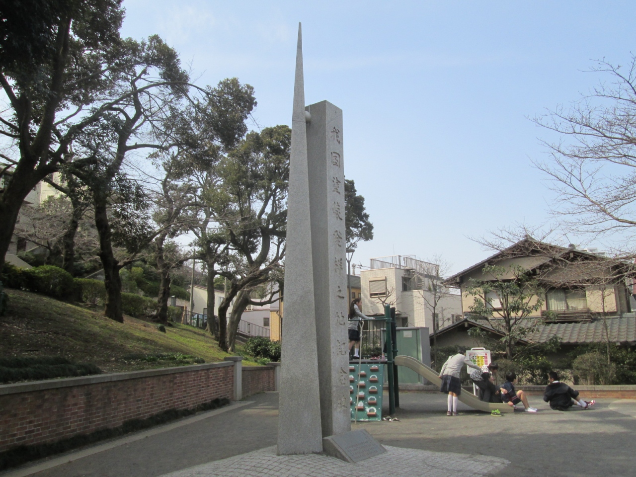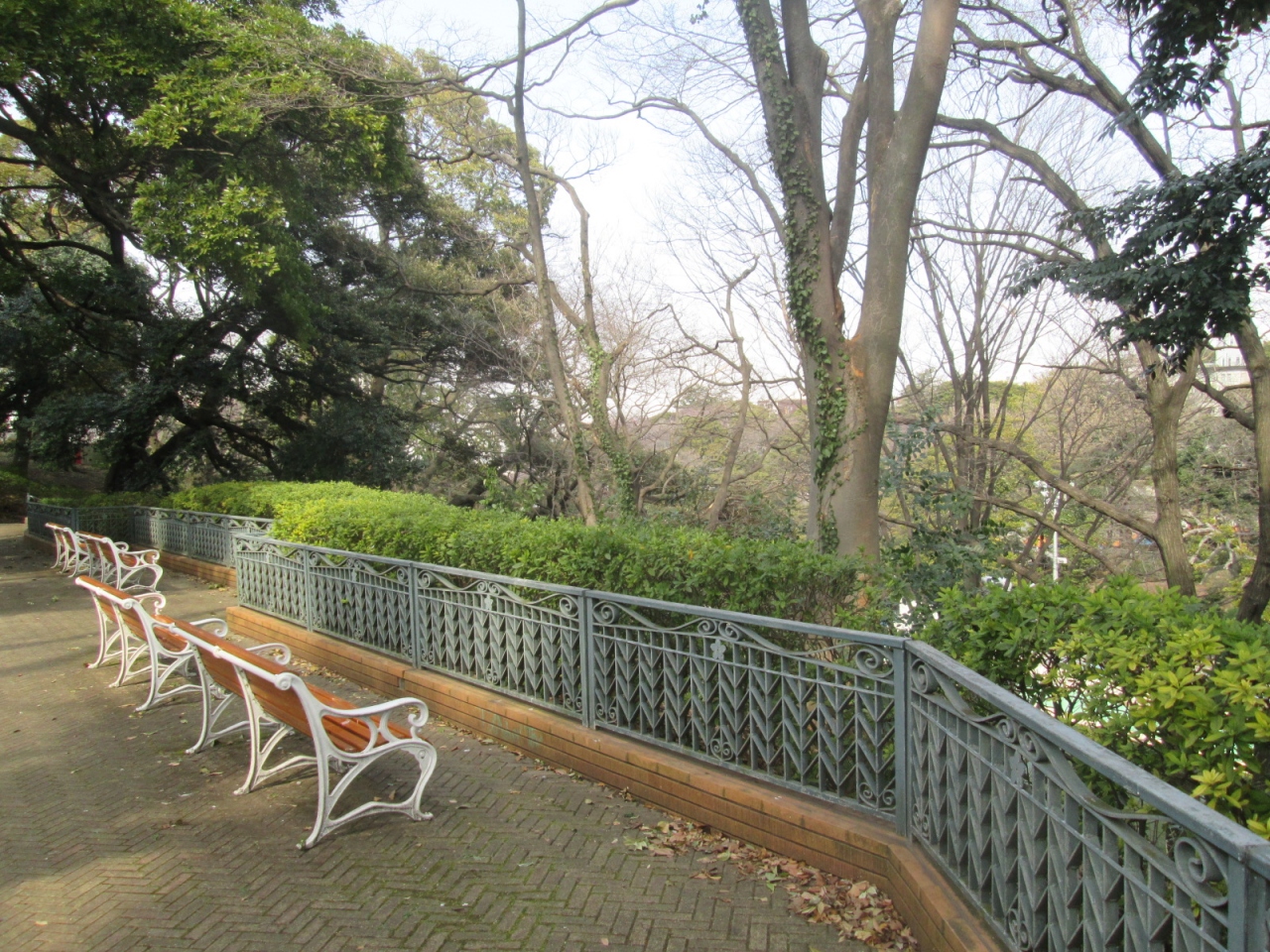 洋館の建ち並ぶ山手本通り、その「エリスマン邸」と「ベーリックホール」から公園が始まります。両館の間を入ると、関東大震災で倒壊した「山手80番館跡」があります。現在は地階部分だけが残っており、見学通路が設けてあります。「山手80番館」を越えると、木立の下にはベンチがいくつも置かれ、休息ポイントになっています。さらに丘を下って行くと、「ジェラールの瓦工場と水屋敷跡」と書かれた碑があります。フランスの実業家ジェラールが、この場所で在日西洋人のための西洋瓦を焼き、また船舶に給水するために建設した貯水槽を記念したものです。横には「我国塗装発祥之地記念碑」というものも立てられていて、そこでは中華学校の子ども達が中国語をしゃべりながら(当たり前ですね)遊んでいました…横浜らしい光景ですね。