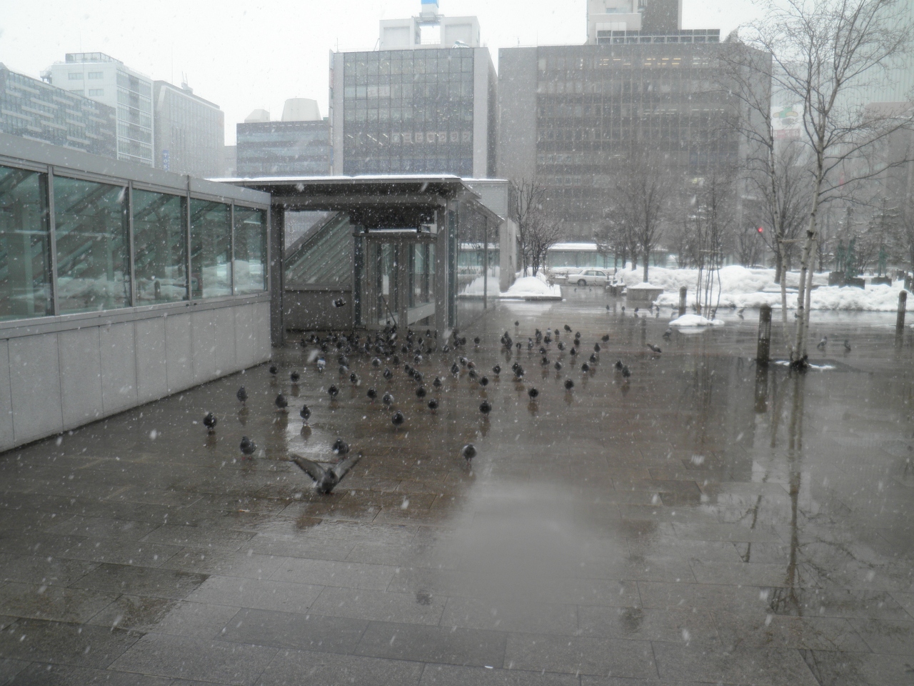 JR札幌駅の南口広場は、元の札幌駅の駅舎があったところでかなり広いスペースです。 ここにはよくみると、芸術作品がいくつか配置されています。 牧歌の像もそのひとつで、のどかなシーンをあらわしているようですが、3月の札幌はまだ雪が多く寒々とした感じでした。 カメラで写そうとしたのですが、周囲に鳩が多くカメラをポケットから出すとエサがもらえるものと思ってよってきました。 ちょっと怖いので画像で牧歌の像は右上に遠目で写っています。