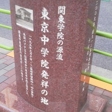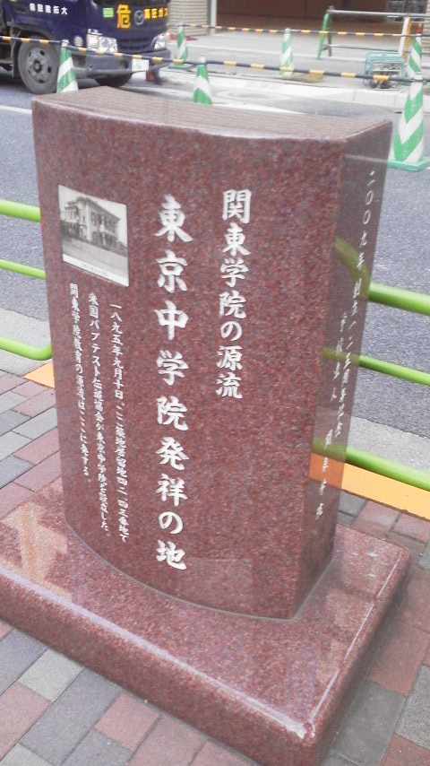 聖路加病院の近くの明石小学校に並びの歩道に石碑がたっているのがここ「東京中学院発祥の地 」。ここは、現在では、近代的なイメージの明石小学校の出入り口の近くにあります。なんでも、この「東京中学院」は キリスト教プロテスタントの一教派が設立した男子校で、その後の「関東学院」の源流の一つとなった学校とのこと。今では、関東学院大学もここがひとつのはじまりだったということですね。