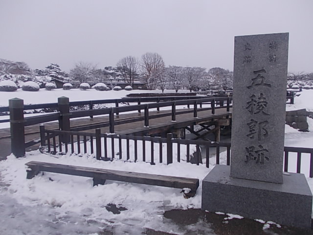 五稜郭は函館のみならず北海道を代表する観光地ですので、冬はきちんと除雪されている所が多いのかな、と思いきや、意外と適当にしか除雪されておらず、踏み跡を信じて突き進んで行くと、急に途切れる、なんて場所が結構あって、靴の仲がずぶ濡れになってしまいました。出来れば3月下旬の時期の五稜郭観光は、郭内に入らず、五稜郭タワーから眺めるだけで満足した方が良いかもしれません…(涙)。