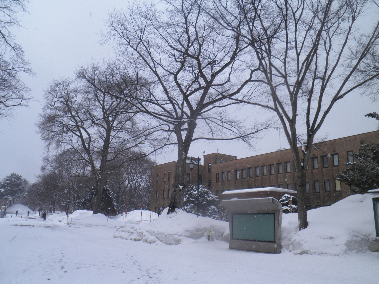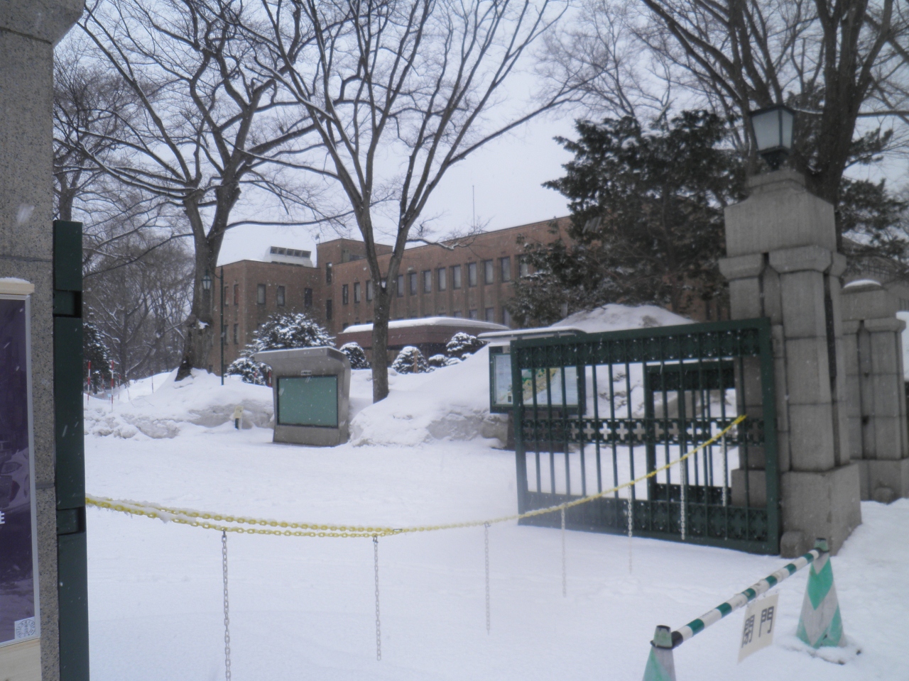 JR札幌駅から徒歩で北西方向に向かい、ヨドバシカメラの大きなビルを過ぎると、北海道大学の正門に到着しました。 この正門の近くに北海道大学本部 (旧北海道帝国大学予科教室)の立派な建物があります。 もう3月の下旬だけど、雪が多く建物の前に積もっていました。 春休みシーズンだけど、寒いせいか観光客は少ないようでした。
