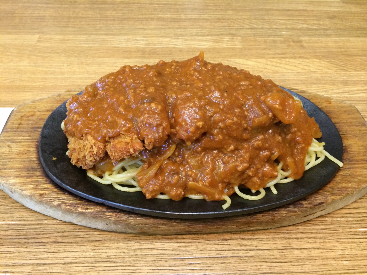 釧路名物スパカツを食べようと調べてヒットしたのがこのお店。栄町の歓楽街の中にあります。ハンバーグやステーキ、パスタなどメニューの数はたくさんありましたが、予定通りスパカツを注文しました。何分か後、バチバチと音をたてながらスパカツが運ばれてきました。熱く焼けた鉄板にパスタ、トンカツ、その上にミートソースがかかっています。ミートソースはトマト味が勝ることなくとてもマイルドな味でした。量もたっぷりとあり、男性でも満足できます。最後の方はパスタが焼けてカリカリする感じでしたが、それもまた美味しかったです。