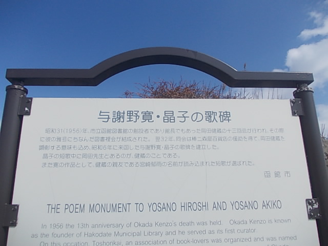 与謝野夫妻の歌碑に関しては、碑としては何となく存在感が薄いように感じます。と申しますのも、こちらの碑は立待岬エリアの一番脇にあって、崖下にあるために駐車場などからは見えないからで、見逃す方も多いようです。徒歩でアクセスされると、丁度道なりに下に降りる階段が見えてきますので、これを通じて歌碑の前まですぐに行けます。与謝野夫妻は啄木本人ではなく、彼の義弟である宮崎郁雨や啄木資料の保存に力を尽くした、当時の箱田渋谷区手図書館長の岡田健蔵などと濃密に交流していたようで、彼らに対する思いが籠められた短歌が、こちらの歌碑に刻まれています。