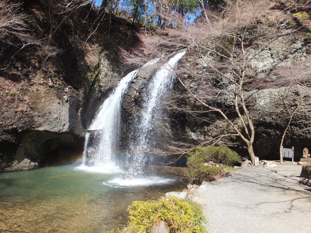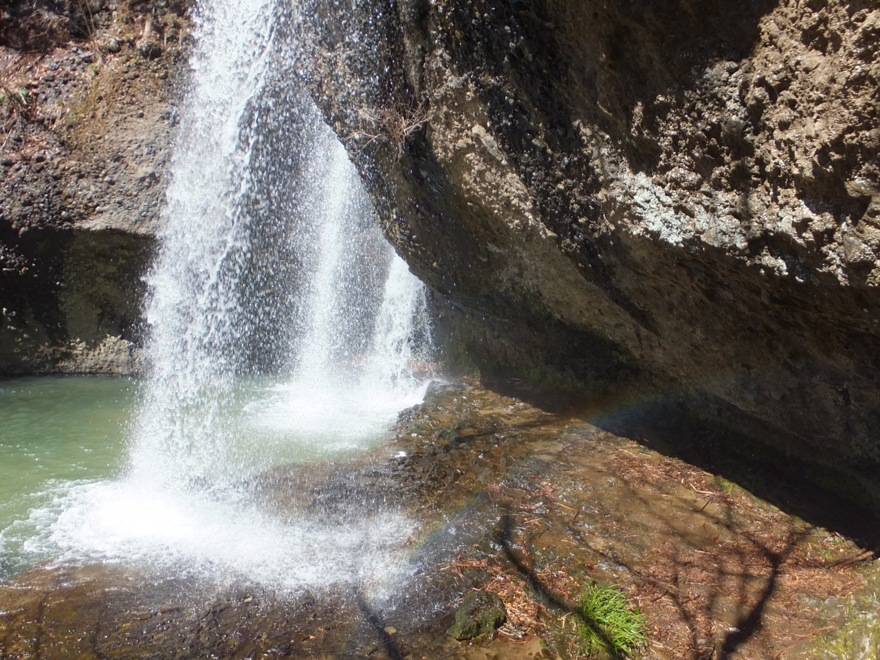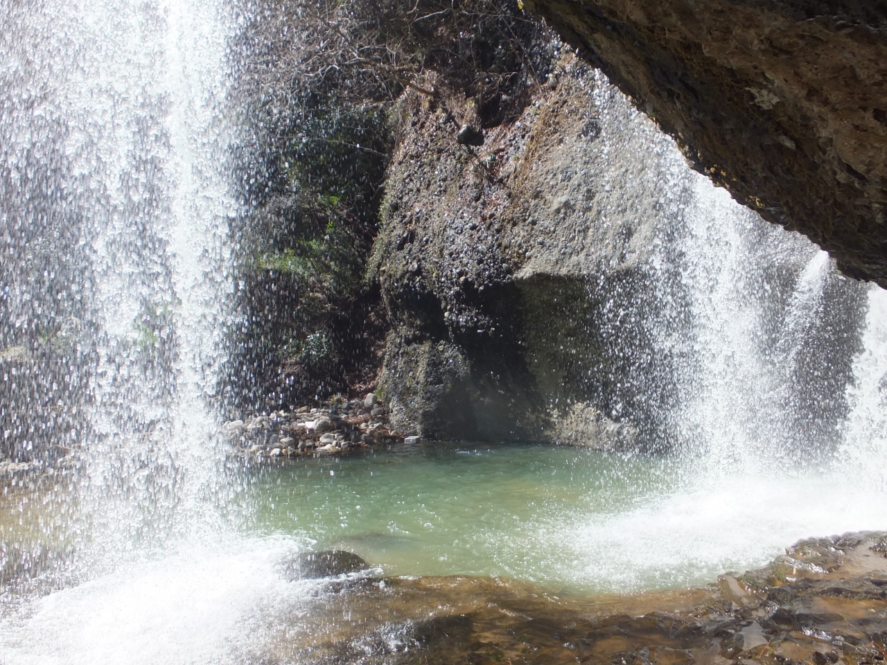 流れ落ちている滝のすぐ横から、滝の裏側の岩場に入ることができます。足場が濡れているので滑らないように気をつけながら滝の裏側に入ると、滝のしぶきを全身で浴びながら裏から滝を間近に見ることができます。しぶきといっても霧のような感じなのでびしょ濡れになるというものではありません。自然のパワーをもらったような気持ちになれます。駐車場からも近いです。
