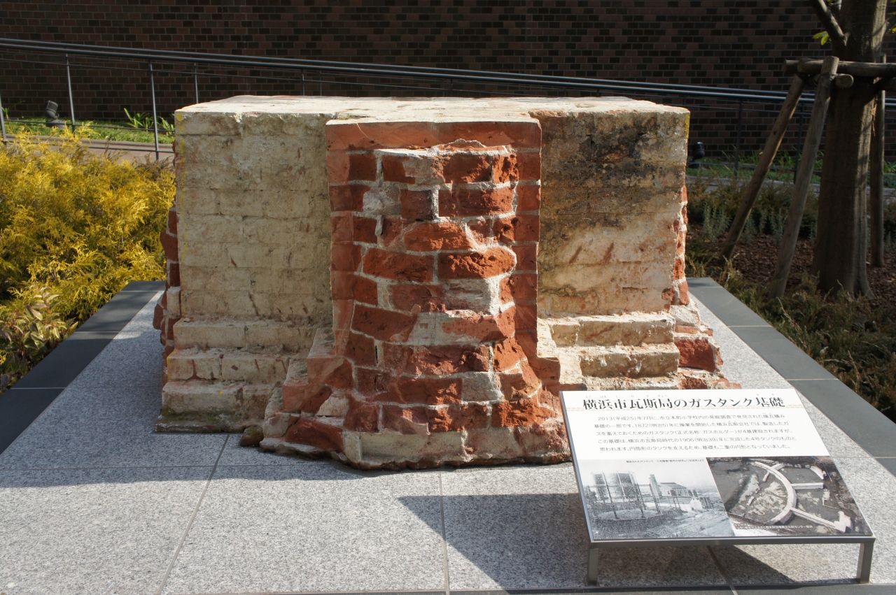 横浜都市発展記念館の中庭に、明治のガスタンク基礎が展示されています。これは、横浜市立本町小学校の校庭から出土したもので、日本で初めてガス事業を起こした「横浜瓦斯会社」の遺構です。ちなみに、横浜瓦斯会社は、馬車道などの日本最初のガス灯にガスを供給した会社。後の東京ガスにつながっていきます。