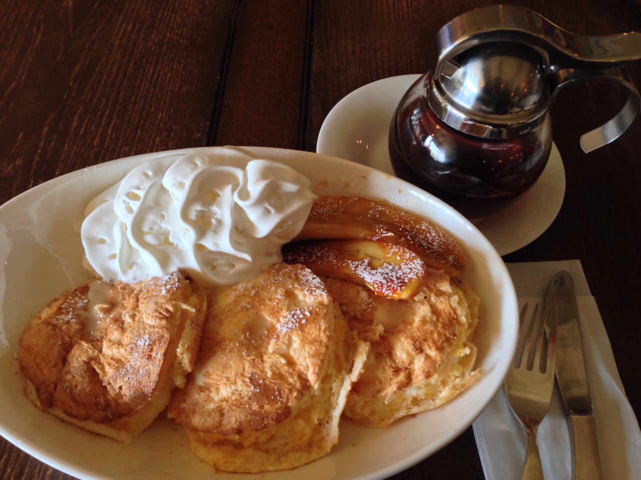 注文したスフレパンケーキは、軽くふわふわの生地とさっぱりクリーム、キャラメリゼしたバナナの食感が良かったです。