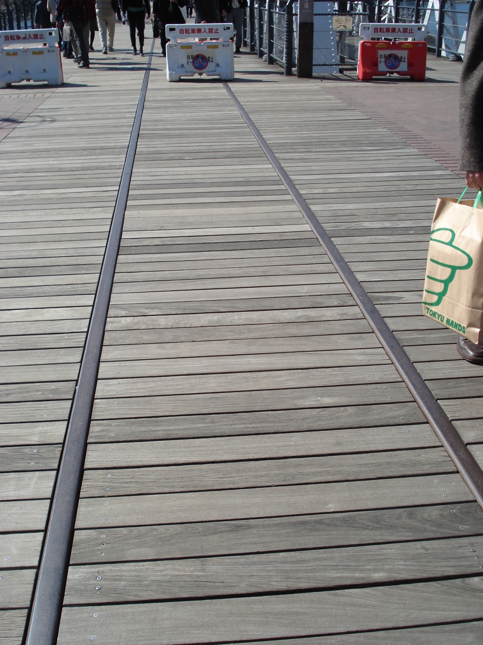 みなとみらい地区から赤レンガ倉庫へと歩いて行く途中に線路の軌道があるのに気がつきました。これが「汽車道」と呼ばれる遊歩道。