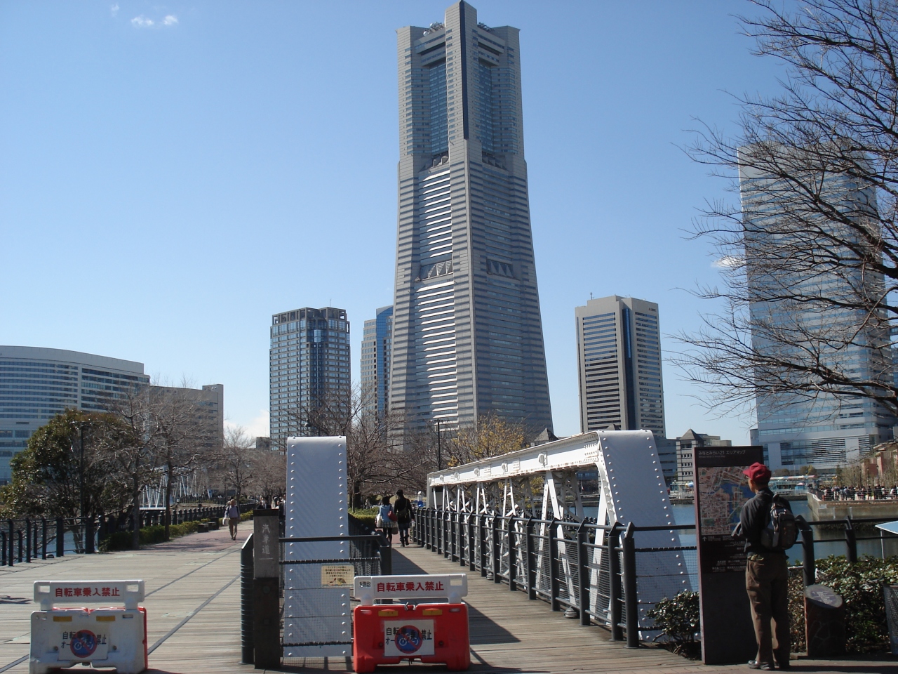 途中で振りかえってながめると、みなとみらい地区とのコントラストが絶妙です。歴史遺産の軌道とモダンな街並みがマッチし、なかなか味わいのある道です。