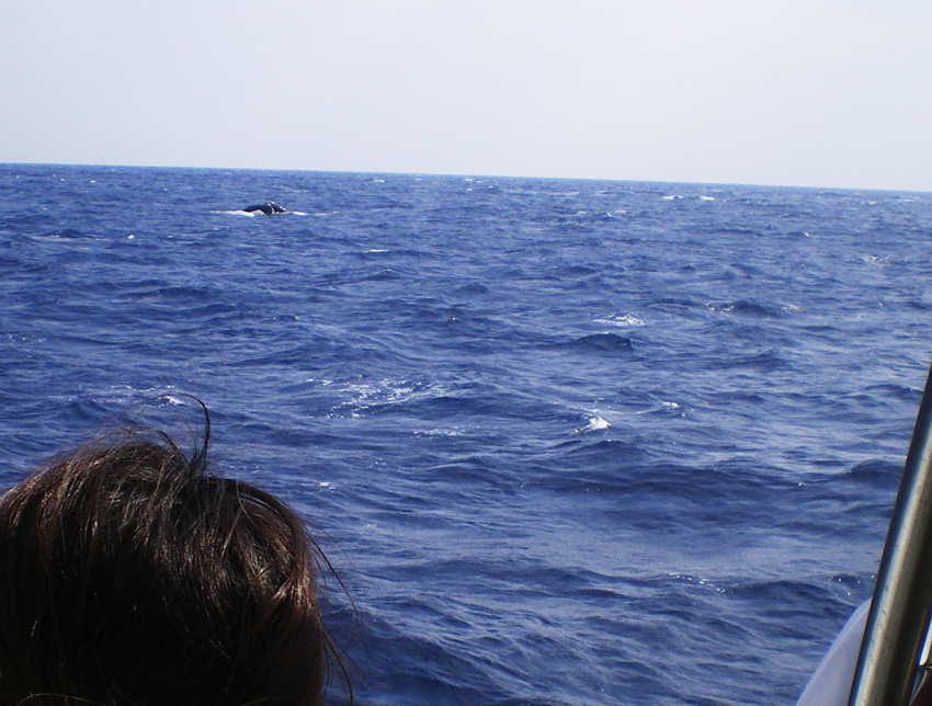やや波が高いものの晴天に恵まれたホエールウォッチング。生まれて始めての体験に、船酔いも忘れるほど興奮しました。20人ほど乗ったクルーザーで沖に出ると、あちこちから出てきた船が集まっている海域へ。すると間もなく進行方向やや右、50m先くらいのところでクジラがジャンプ(ブリーチ、ですかね)。その後も3頭が姿を現してくれました。やはり大きい!頑張ってカメラのシャッターを押しましたが、なかなかうまく撮れなかったことが残念。でも、本当に興奮する体験でした。