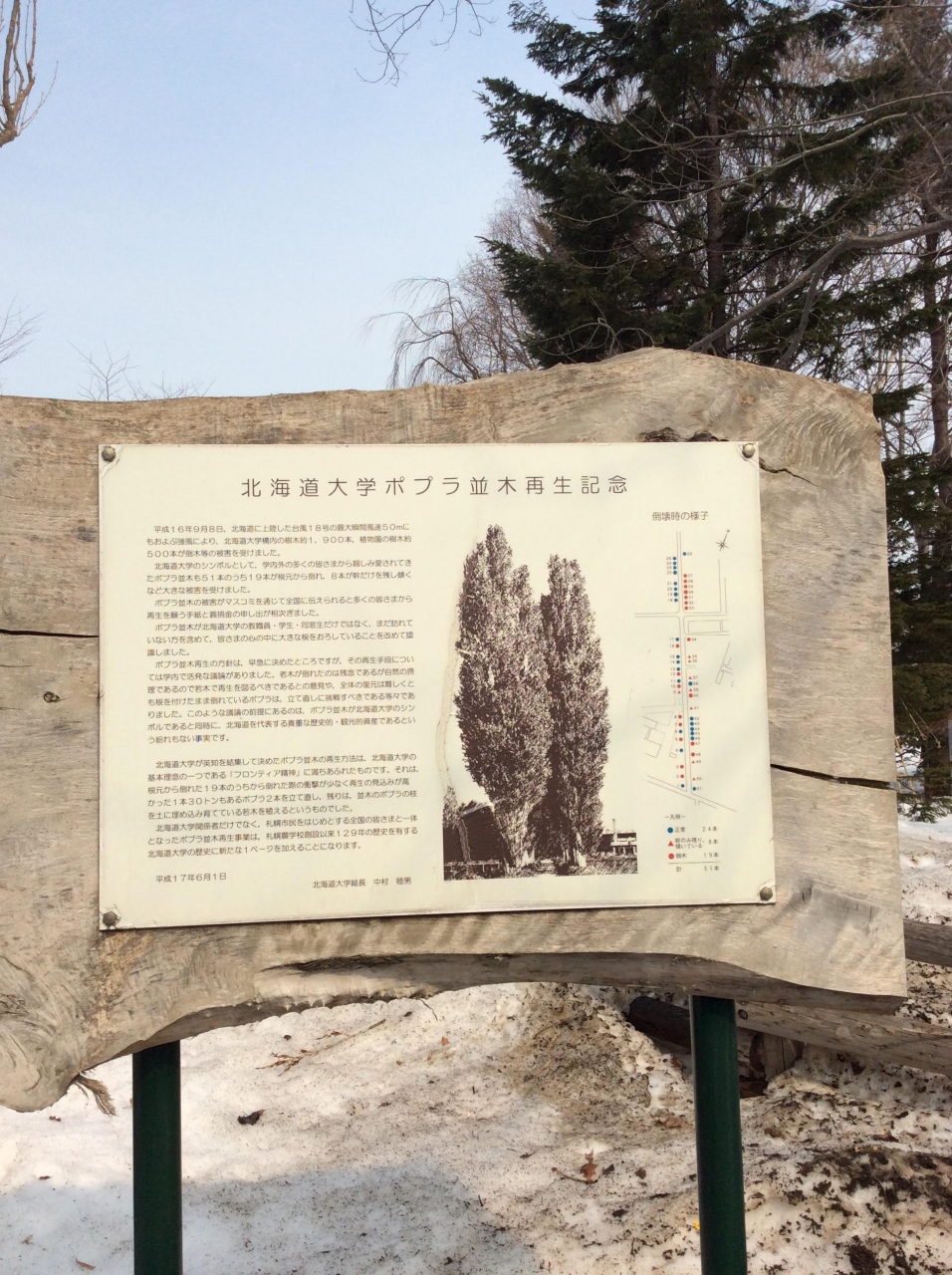 北大のポプラ並木を観に来ました。ちょうど、北海道大学の卒業式の日だったためか、羽織りを着た女子学生が記念写真を撮っていました。ポプラ並木道は、雪が結構、残っていて、除雪がされていないので、歩くことは出来ません。
