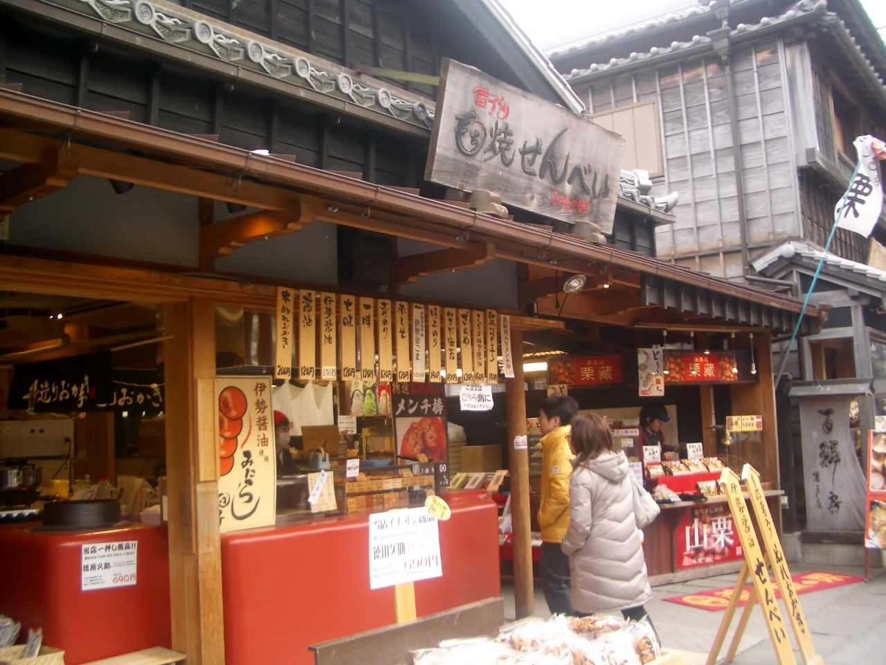 おはらい町にお店はありました。店頭で、お煎餅を焼いているので、香ばしい醤油のいい匂いが漂っていました。お煎餅は、焼き立てを1枚から購入することが出来ます。