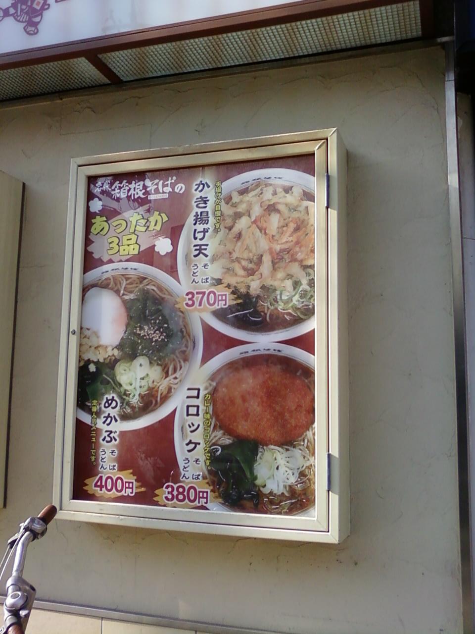 ここの名代箱根そばさんは、小田急線向ヶ丘遊園駅の南口すぐ右脇、踏み切りのそばにあります。比較的小さめの店内で、夜も21時30に閉まってしまうのが残念。それでもだいたい500円未満でそばやうどんが食べれたり、期間限定でコロッケや玉子などの無料クーポンを配ったりしているのでとてもお得です。めかぶうどんなど、さっぱりしていてダイエットにいいかも。