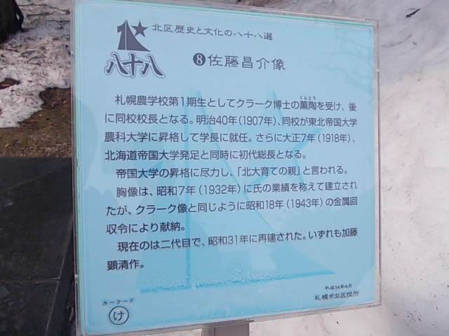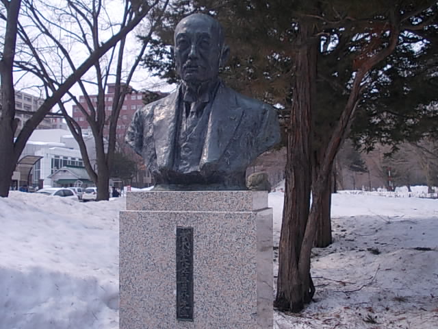 北大と言えば、農学校時代のクラーク博士のイメージがどうしても先行してしまいますが、札幌農学校の第一期卒業生として、その後の自然科学系総合大学としての北大を築いていった功労者としてこちらの方が知られています。像自体は戦前に造られたのですが、戦時中に金属回収のため一旦なくなってしまったそうで、再建されて現在の姿になったのは、1956年のことです。事務局向かってすぐ左手にありますが、ちょっと奥まった場所にありますので、見逃さないようにご注意下さい。