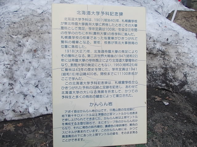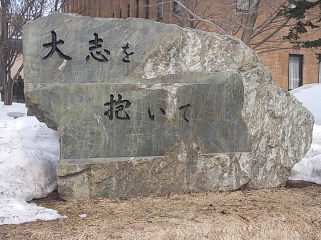 現在北海道大学の事務局となっている旧制予科校舎の脇には、こちらの碑が建てられていますが、奥にひっそりと佇んでいる元帝国大学総長の佐藤氏の像と比較すると、こちらの存在感は抜群で、日高のかんらん岩を用いて造られたという、重厚感のある記念碑です。刻まれている言葉もシンプルで読みやすいので、心にグッとくる素敵な記念碑だなという印象を受けました。