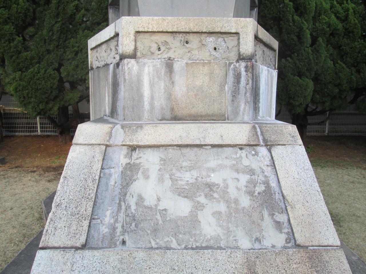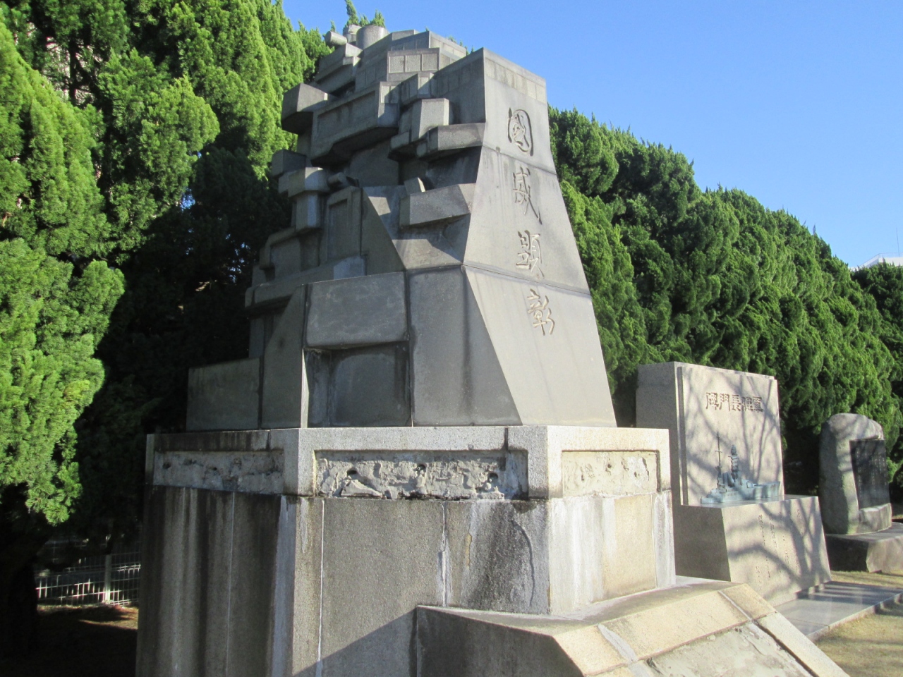 「ヴェルニー公園」内にはいくつもの碑が集められた一角がありますが、その中の一つです。なかなか大きな碑で、戦艦や巡洋艦など大型軍艦の艦橋を模したものであることは瞬時に分かると思います。ただ…どのような経緯なのかは分かりませんが、碑の目的を示す銘板が剥がされており、どういった意味を持つ碑なのかは不明なままでした。一説によると”八紘一宇”と書かれていたとも言われていますが、確かめる術はありません。しかし、銘板も剥がされた無残な姿でそのまま放置しておくのは、如何なものでしょう…。例えばの話になりますが、例え銘板にあった文字が右翼的なもの・あるいは横須賀市や日本国政府に都合の悪いものであったにせよ、歴史をそのまま受け入れることなくして将来につなげるのは難しいですし、こうした無残な形で碑を晒しものにする神経も私には理解できません。今のままであれば、碑そのものを撤去した方が良いのでは…とも思いました。