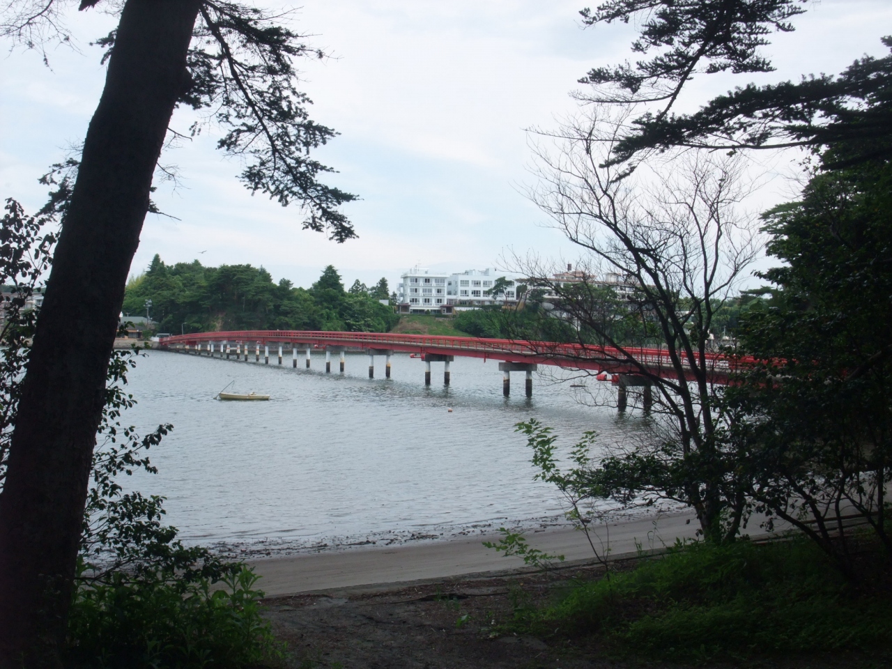 福浦島に行ってきました。出会い橋ともいわれる福浦橋の袂には、料金所兼売店があります。福浦橋は、全長252m、幅2・6mの朱塗りの橋で、人道有料橋となっており、大人200円、小中学生は100円を払わなければ、橋を渡ることができません。近くには大きな駐車場もあります。私たちも駐車場に車を止め、一人200円を払って福浦橋を渡って行きます。