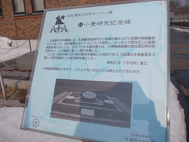 こちらの記念碑は、理学部の裏にあって、観光客が訪れることは稀な立地ですが、日当たりが良い場所にあって、多くの雪に埋没している北大構内の記念碑と比較すると、恵まれた環境かな、という印象でした。碑の形もちょっとユニークですので、少し遠いですが、ポプラ並木の観光ついでなどに是非足を運んでみて下さい。