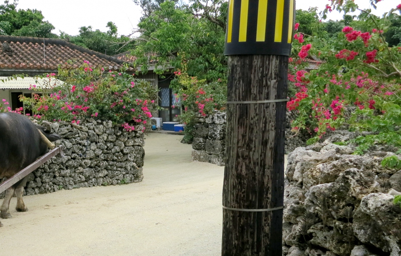 赤瓦の屋根と石垣の集落を水牛車で観光。