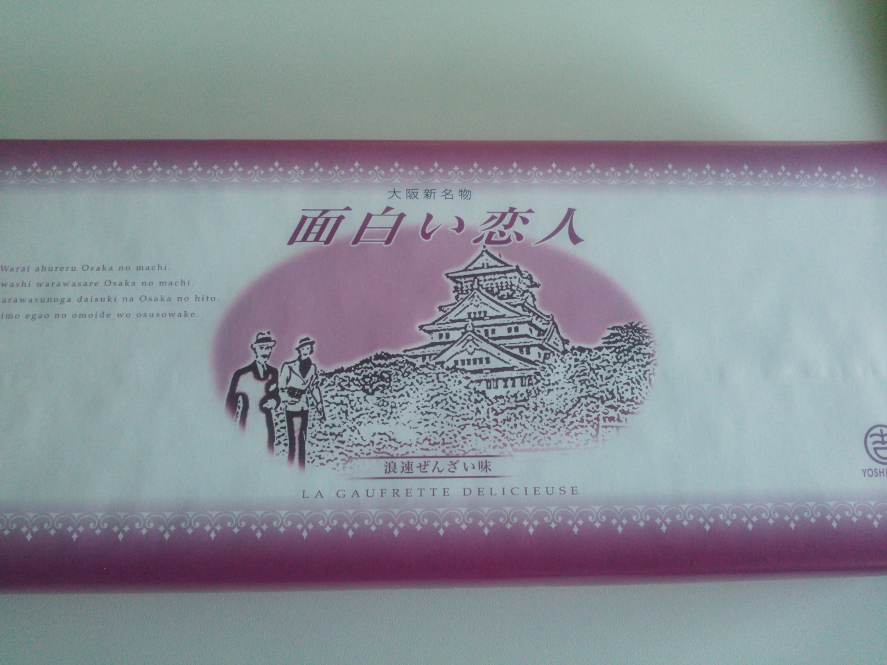 さすが大阪人と思わせるような”白い恋人”のパクリで”面白い恋人”です。いただいた時に思わず笑ってしまいました。中はゴーフルで、まともにと言っては失礼ですが、美味しかったです。大阪みやげにオススメです。