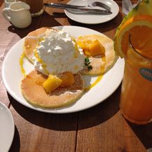 写真で見るとクリームがたっぷりで重そう…という印象だったので2人でマンゴーのパンケーキを1つとアイスコーヒー、グァバとパッションフルーツのジュースを注文しました。