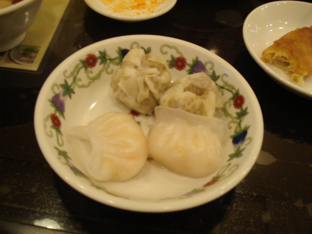 それには春巻き、肉シュウマイ、エビの水餃子各1、スープ、ザーサイ、ご飯、デザートが付いてお得感一杯。相棒のお酒がプラスされてもお札3枚。