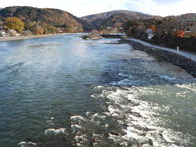 この時は12月の冬の始め頃で、紅葉の色がわずかに残る付近の山肌を背景に、幅の広い川が速めに流れていて、風情を感じるいい構図になっていました。
