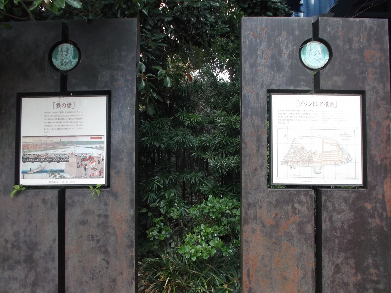 日本初のトラス鉄橋として架けられた、その記念「鉄の橋」「ブラントンと横浜」碑が、馬車道通り・イセサキモールに継る吉田橋のところにあります。