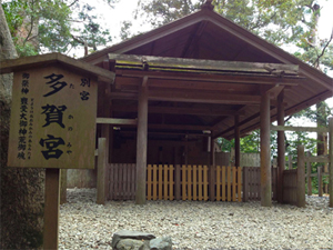 豊受大神宮大前の御池にかかる亀石を渡ると、右手に土宮、左手に風宮があり、正面石階を上がると第一別宮である多賀宮があり豊受大御神荒御魂が御祭神となっています。