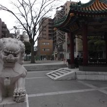 ここにあるあずまやは會芳帝です。中華街の歴史ある場ですが、今では児童公園でもあり、観光旅行者の休憩・憩いの場として利用されています。ちょうど休憩するのに便利なところです。
