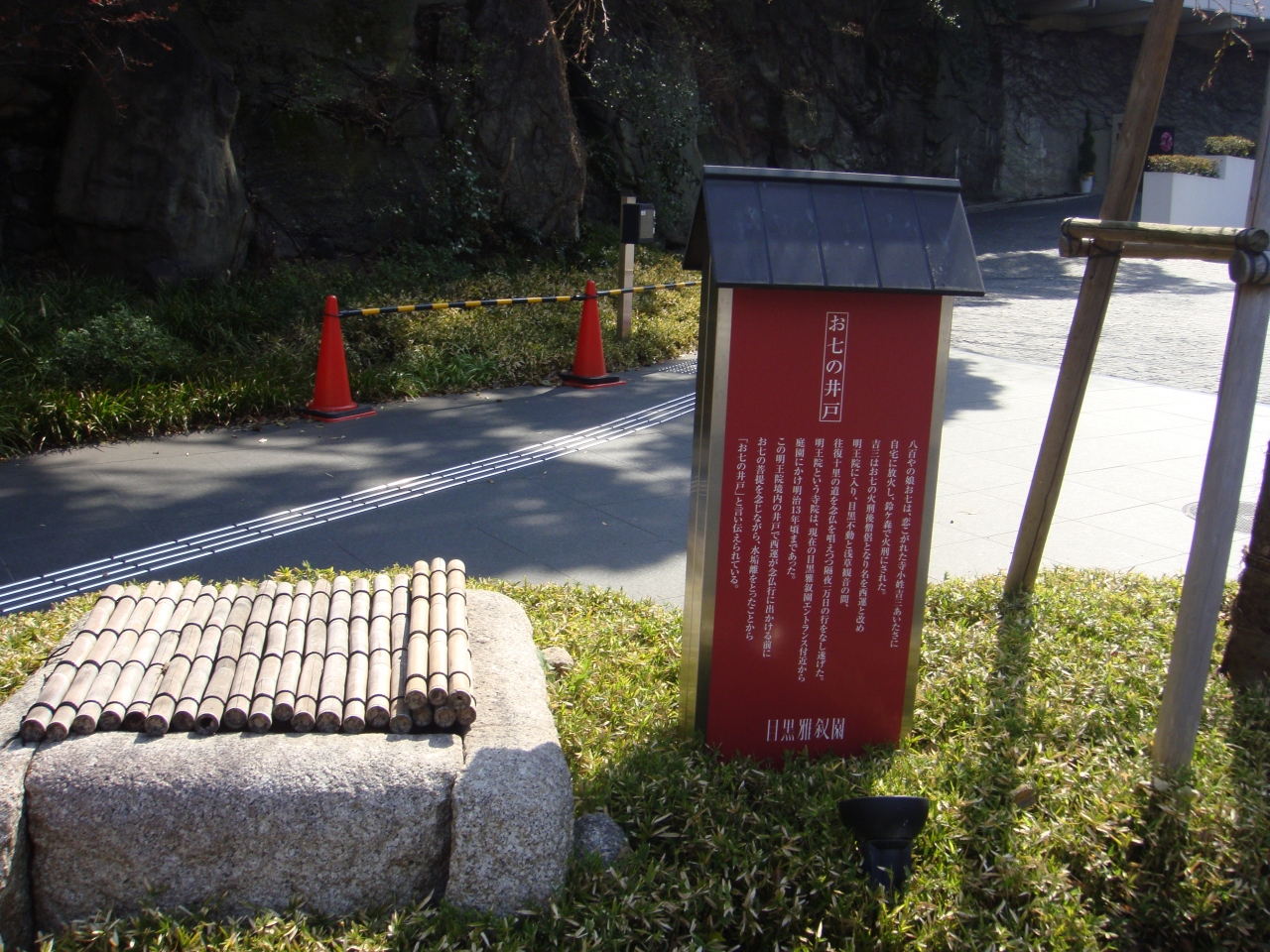 JR目黒駅から行人坂を下ると雅叙園の玄関前に「お七の井戸」があります。八百屋の娘お七は、大好きな吉三に合いたさに自宅に放火し、鈴ヶ森で火刑にされた、悲しい話ですが、その後吉三が僧侶になり、この井戸でにお七の菩提を念じながら、水垢離をとったことから「お七の井戸」と言われるようになりました。