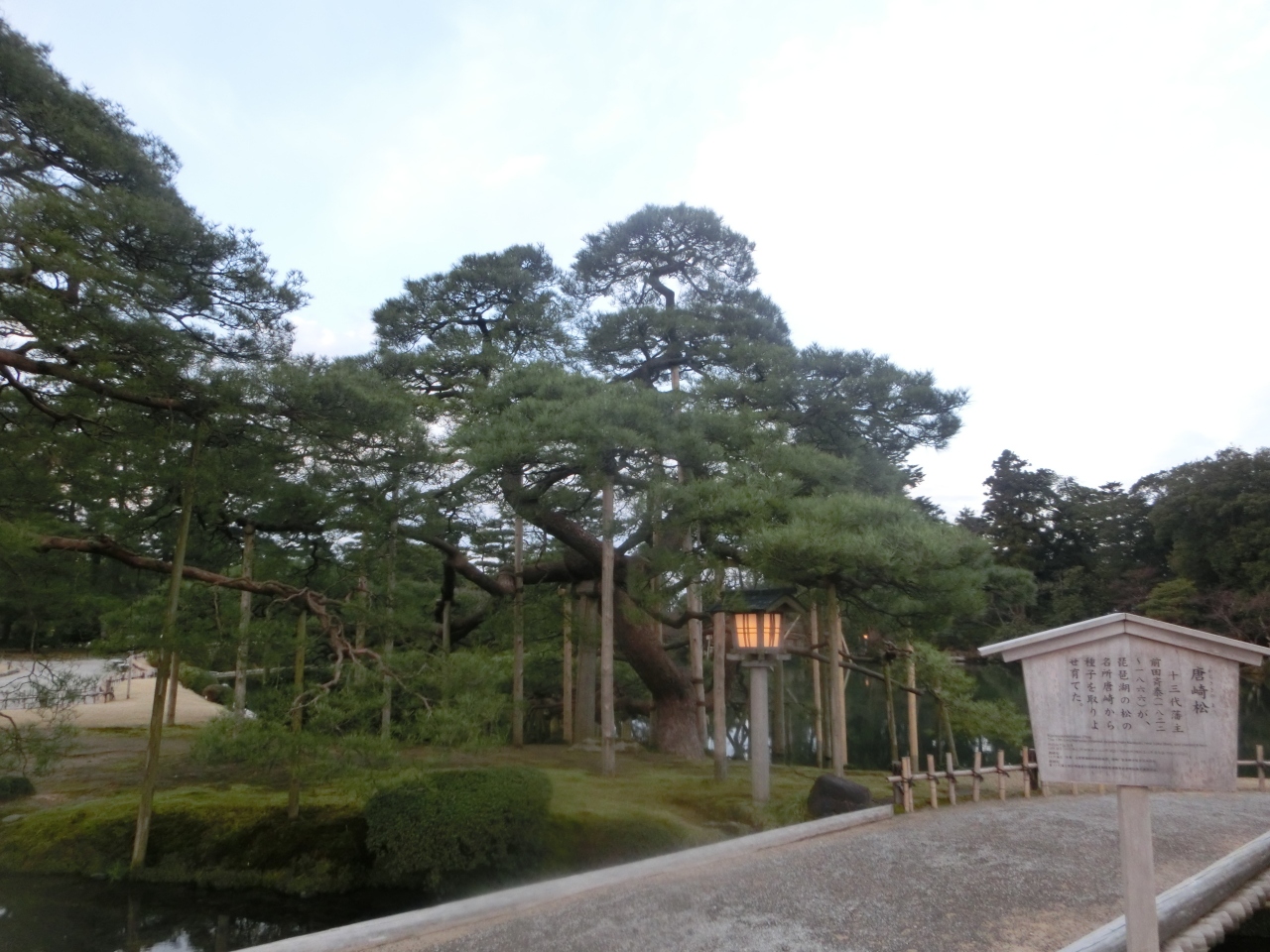兼六園にある唐崎松は、兼六園の中心の霞ヶ池にあり、人気スポットの徽軫灯籠のそばにある枝ぶりのとっても見事な松です。13代藩主・前田斉泰公が近江八景の一つである琵琶湖畔の唐崎松から種子を取り寄せて育てた黒松だそうです。