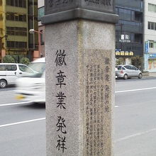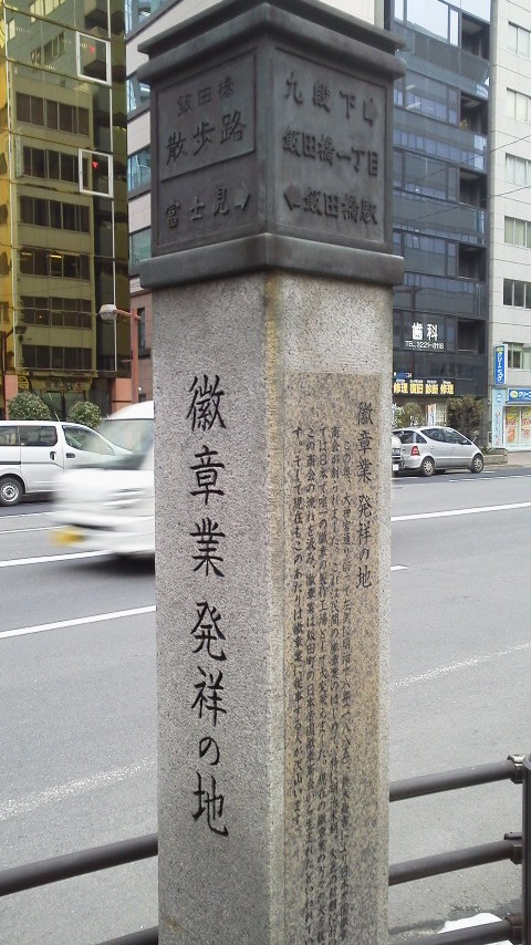 飯田橋駅から九段下までわたる歴史的趣を感じる”飯田橋散歩路”にあるのがここ「徽章業発祥の地」。ここは、”飯田橋散歩路”でも割と飯田橋駅からちょっと歩いたところにあります。ここは、なんでも、明治18年に鈴木梅吉氏がここに、日本帝国徽章商会を創設したとのこと。ここは、民間の徽章業のはしりで、明治~大正において、徽章の製作工場として発展したそうです。そのため、徽章業が飯田町の日本徽章商会から生まれたといわれるくらいになtっとのこと。