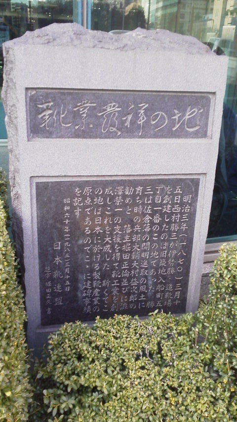 新富町駅の6番出口の入船橋交差点の地上口をでたら目の前にあるビルの脇にひっそりとたっているのがここ「靴業発祥の地」。なんでも、かつて、築地の明石町一帯は明治初時代には外国人居留地だったことから、多くの外国人が居住することになり、その外国人が利用する靴の需要が多り、明治3年、居留地に隣接するこの入船町に、国内初の靴の工場ができ、国内で靴の製造が始まったことを記念して建立されたとのこと。