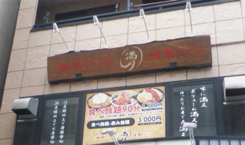 都営浅草線浅草駅のA4出口を出て正面のビルの2階にある、もんじゃ焼き食べ放題 90分、1700円のお店。