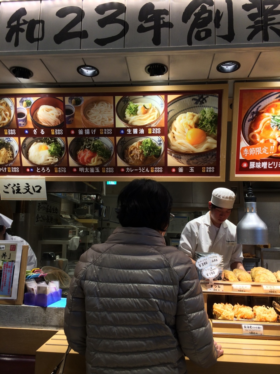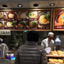 フードコート内の入って右側の1番奥にお店を構えています。500円以内からうどんを食べることが出来て、とってもお手頃価格なのでお昼時に行くといつも列ができています。たくさん種類があるのですが、特に明太子のうどんがおいしいです。