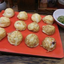 ミツバの薬味を入れたアツアツのだし汁に付けて食べる、たまごのふわふわ感のあるたこ焼です。