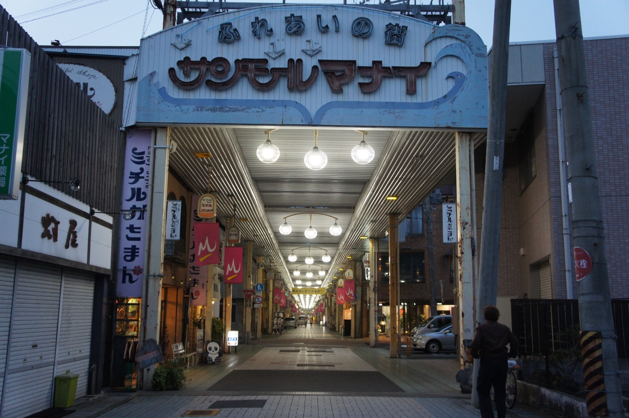 マナイ商店街は、西舞鶴の商店街。入口に「サンモールマナイ」と書いた看板があって、そこからアーケードが始まります。東舞鶴が自衛隊のおひざ元なら、西舞鶴は田辺城があった歴史の街なんですが、商店街は他の地方の商店街と同様、ちょっとさびれた感じも否めない。中ほどに真名井の名水という湧水があって、夕方水を汲みに来る人が何人かいて、目を引きました。