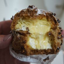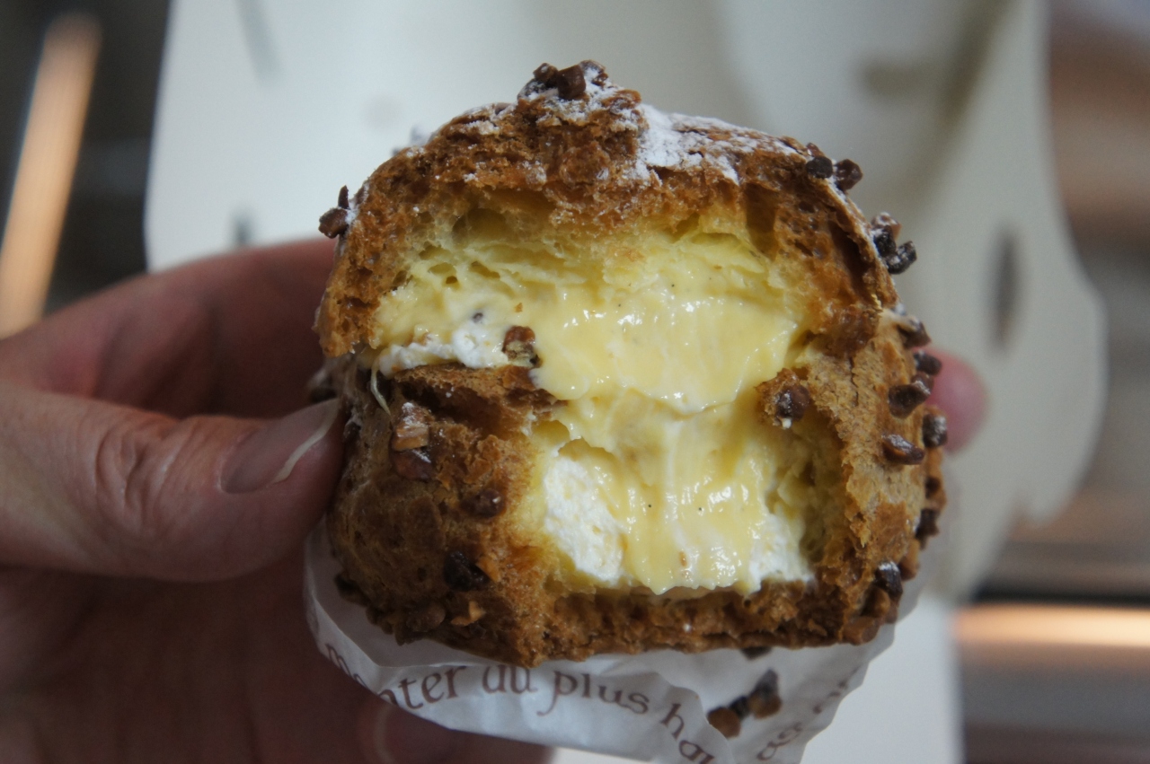 私は、シュークリームをいただきました。木の実が散らされた表面とか、手の込んだ感じ。クリームは、カスタードと生クリームの二種類のクリームが二層になっていて、食べる時の変化を付けていました。この辺りの手の掛け方が人気の背景だと思いますが、敢えて言えば、二層のクリームはベストミックスでこれこその味を追求しているシュークリームと比べるとちょっと逃げの姿勢にも感じられる。好みもあると思いますが、いかがでしょうか。