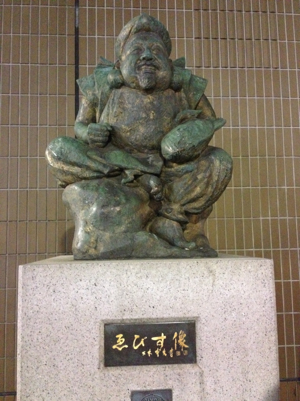 多くの人で行き交うせわしない駅前でにっこりと微笑んでいるゑびす様。