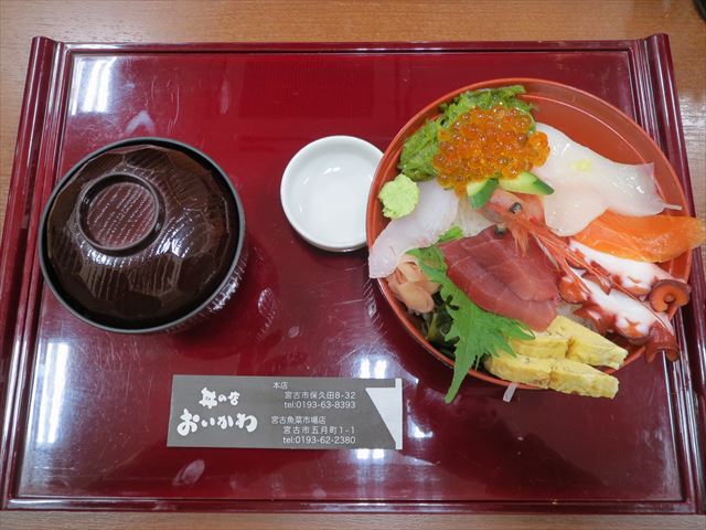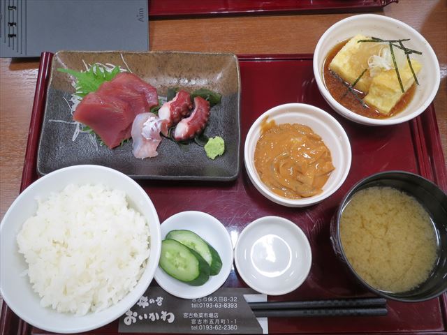 宮古海鮮市場内にある食堂です.海鮮丼は1500円ですが,生ウニを載せると+200円です.定食はマグロの刺身(3切れ),タコの刺身(2切れ),自家製イカの塩辛,揚げ出し豆腐,キュウリの漬け物が付いて750円.どちらも大盛りかお代わりは無料とのことです.