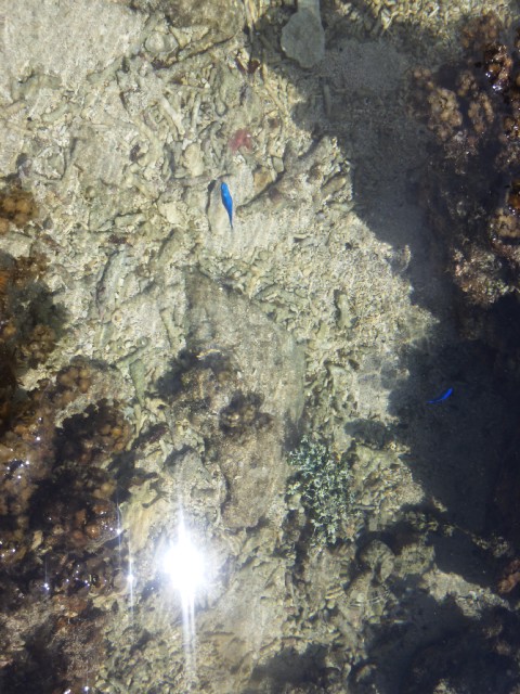 強風なのに泳いでいる人はいるのかと半信半疑で米原の前を通過すると駐車場にはたくさんの車が。。。。子供がいきたいというのでUターンをして駐車場へ。今回は弾丸なので水着もシュノーケルグッズも何も持参していないのでどうしようと思っていたら、レンタル店があいていました。値段はとてもリーズナブルだな~と思いました。男性用水着200円、シュノーケル水中メガネ600円、バスタオルは100円です。本当にこの強風で入るのか~と思いつつ、ビーチに出て見ると幼稚園ぐらいのお子さん連れの家族もいたりして。どうしようかと迷っているうちに息子は既に海に足を入れていたので、水温を確かめるべく足を海に入れて見ると”つめたー”。「冷たいよー」といっても「おとん、もうここに青いお魚がいるよ~」とテンションあがっている息子。仕方なく入っているうちに、ヤガラやらみえはじめて自分の方が夢中になってしまいました。