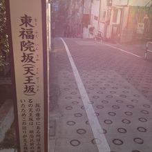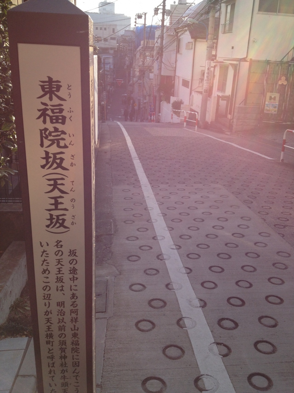 坂の名の由来は、坂の途中にある阿祥山東福院に因んでとのことですが、別名の天王坂は、坂を下りた先の右手の方にある須崎神社が、 明治以前牛頭天王社と称していたためとのことです。