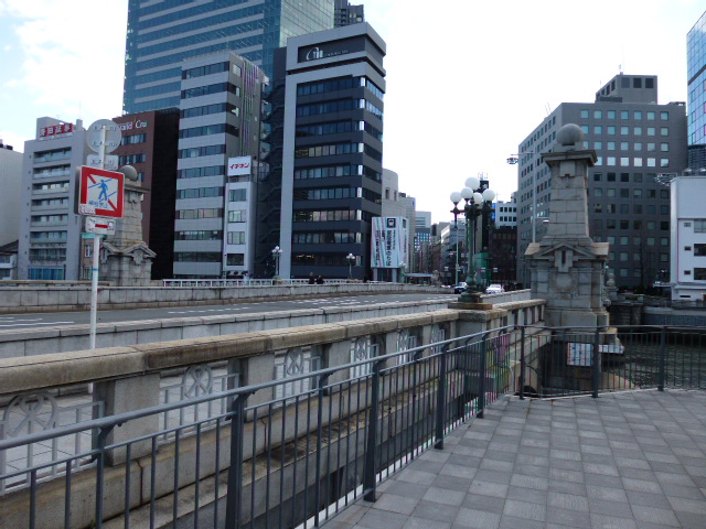 中之島を挟んで、堂島川、土佐堀川の両方にかかっている橋で堺筋が通っています。江戸時代は、この橋は堺筋の西隣にある難波橋筋に架かっていた木橋で、反り橋だったため、周辺の16橋や遠くの山々を眺めることができ、橋の上は花火見物の人で賑わったりなど、観光スポットだったようです。