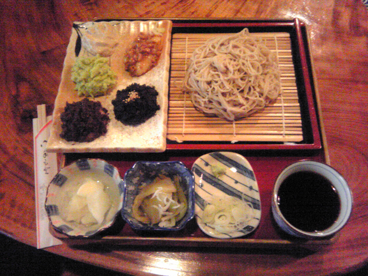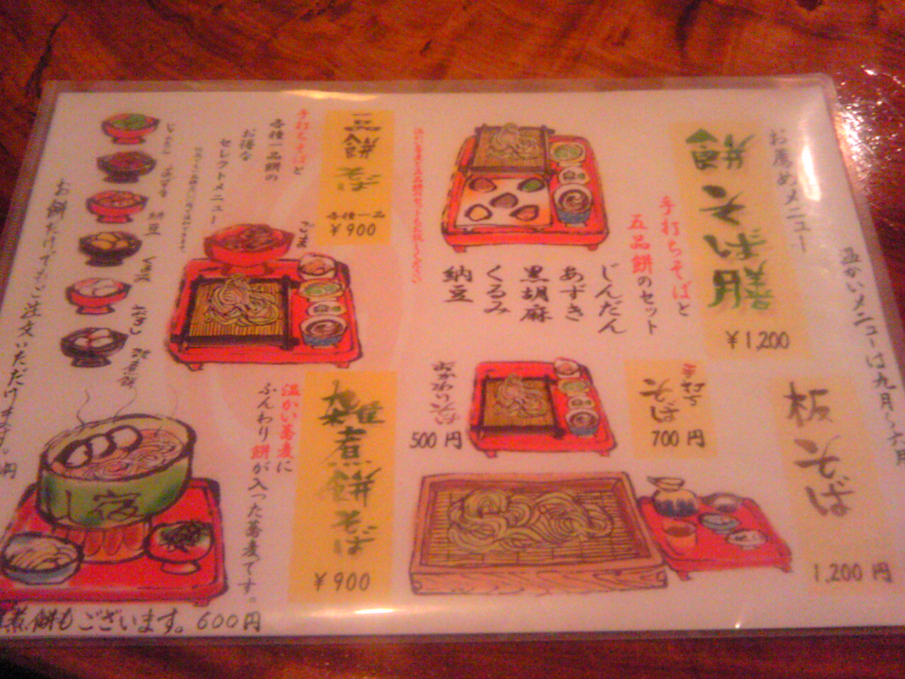 メニューは,蕎麦と言うよりもお餅が主体のような感じです.蕎麦は更級系で,かなり細く切ってあります.お餅は欲張って5種類全部食べられるお薦めメニューの「餅蕎麦膳」(1200円)を注文してみました.お餅は一口大ですが,5つ食べると流石に満腹です.