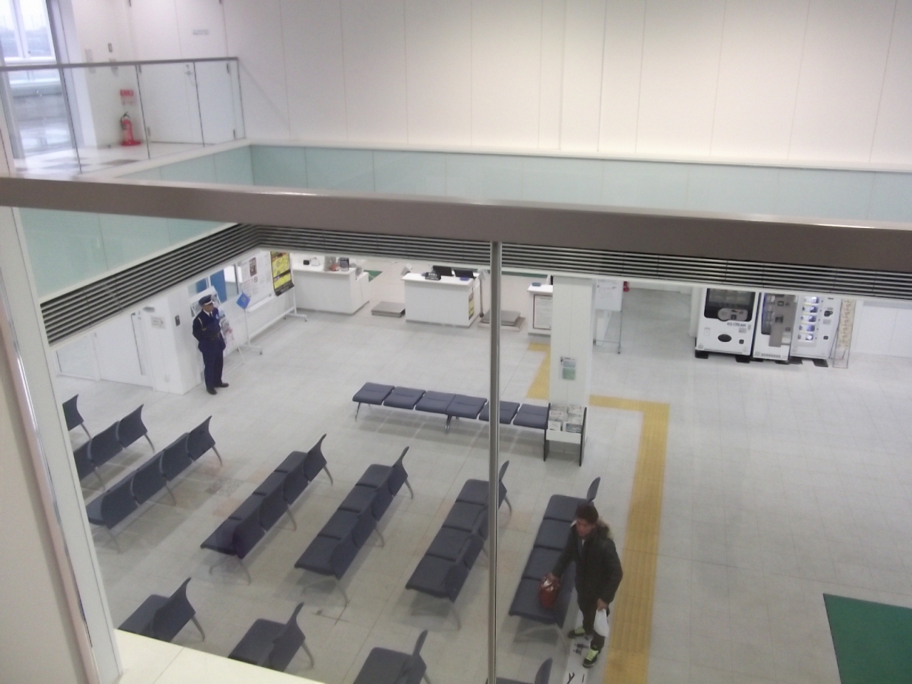 こじんまりとした建物は1階が待合室兼手続きカウンターで、カウンターで予約名を告げて記帳すると搭乗券のようなものはなくレシートが発行される。
